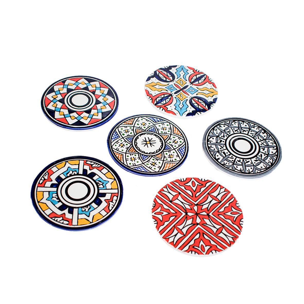 Composé de six sous-verres, chaque pièce présente des motifs uniques inspirés de l'art Zellige marocain, avec des designs géométriques colorés peints à la main.