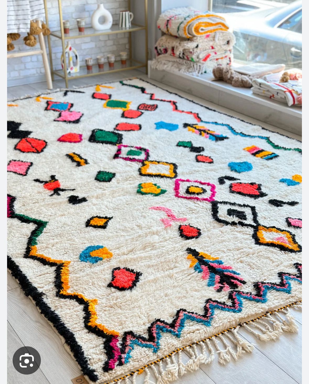 Ce tapis berbère artisanal se distingue par son fond blanc doux et ses motifs géométriques vibrants aux couleurs vives.