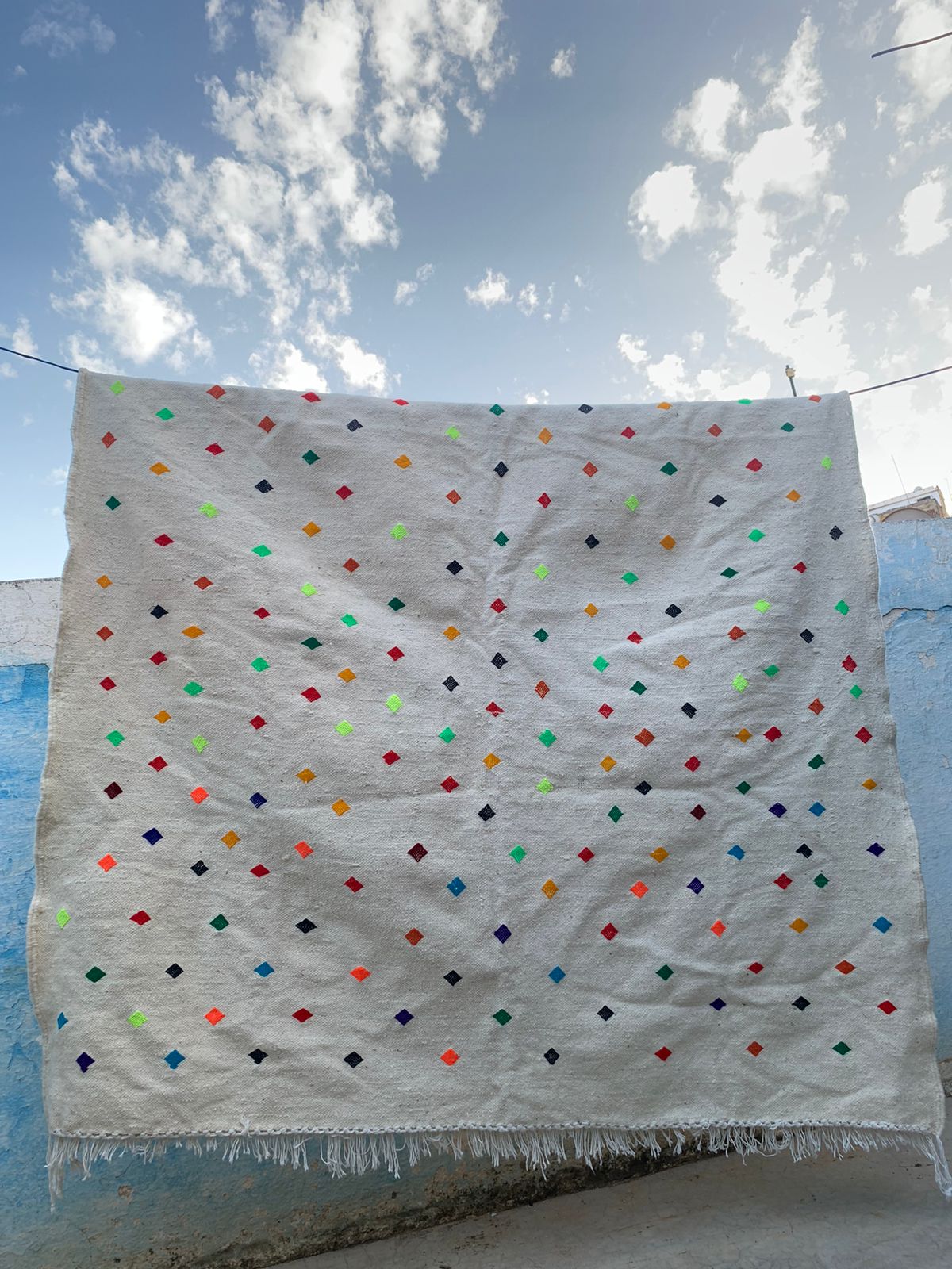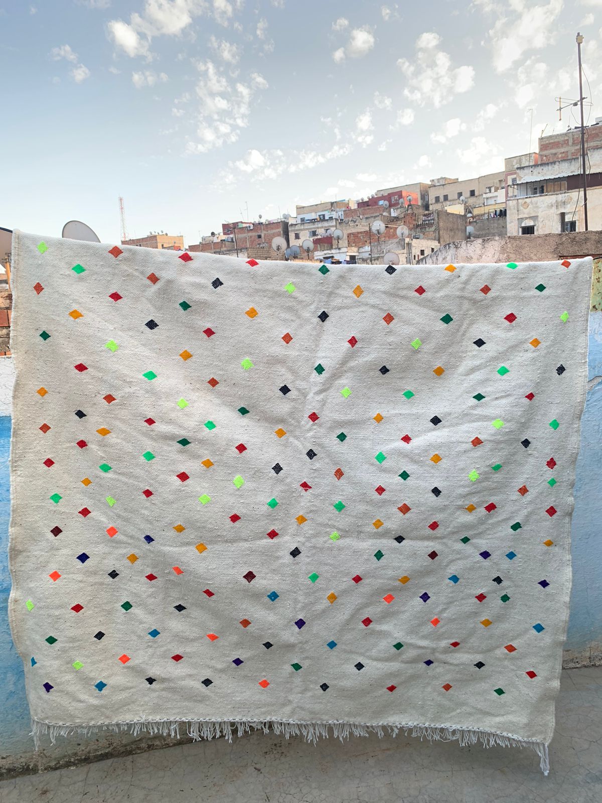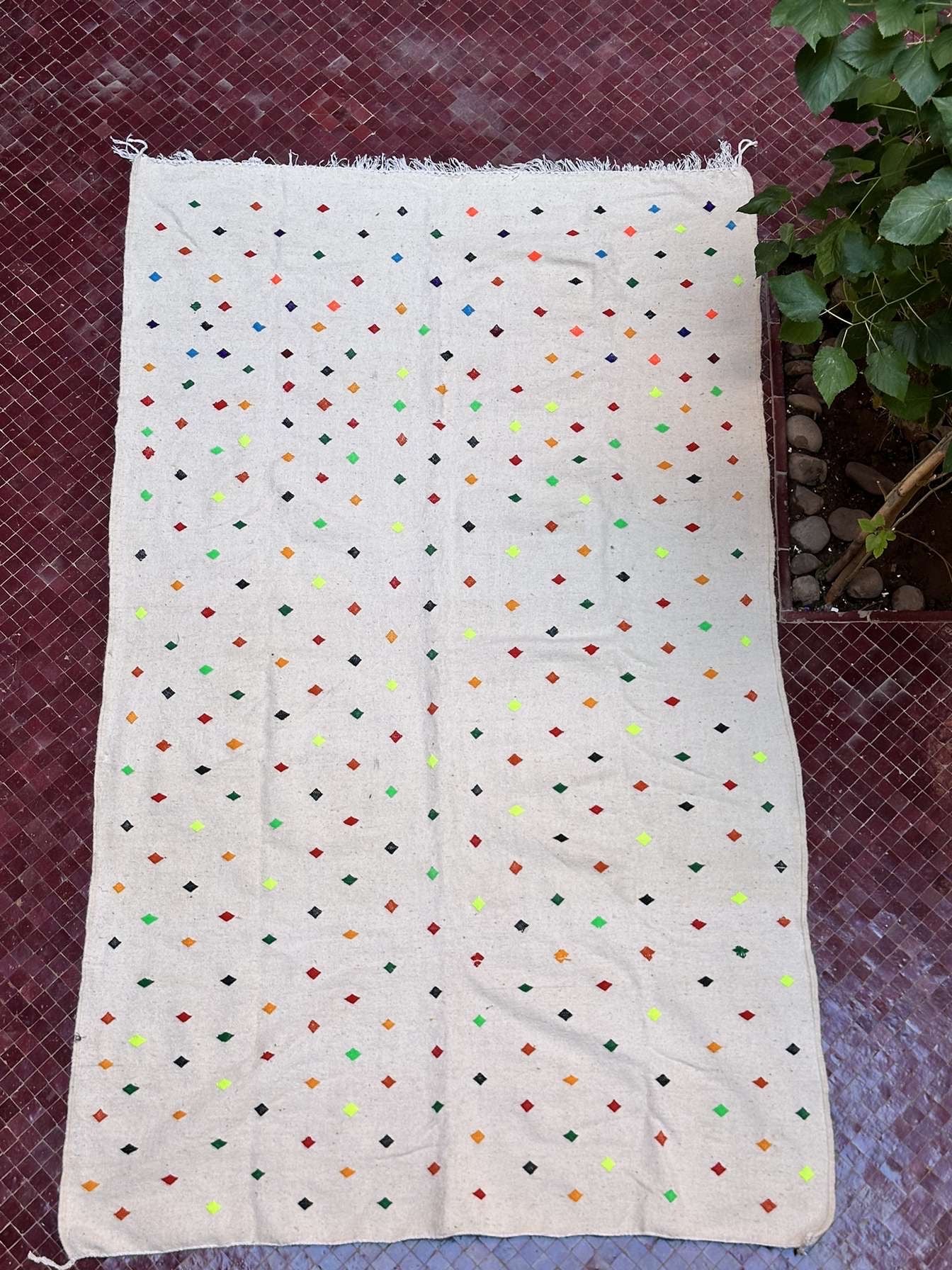 Ajoutez une note de fraîcheur et de gaieté à votre intérieur avec ce tapis berbère Kilim orné de points colorés. Tissé à la main avec soin, il combine tradition et modernité grâce à son design minimaliste et ses touches vibrantes. Idéal pour sublimer un salon, une chambre ou un espace cosy.